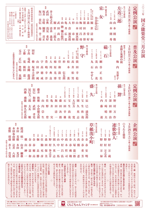 国立能楽堂(東京都渋谷区千駄ヶ谷4-18-1)の3月主催公演が下記の通り上演されます。