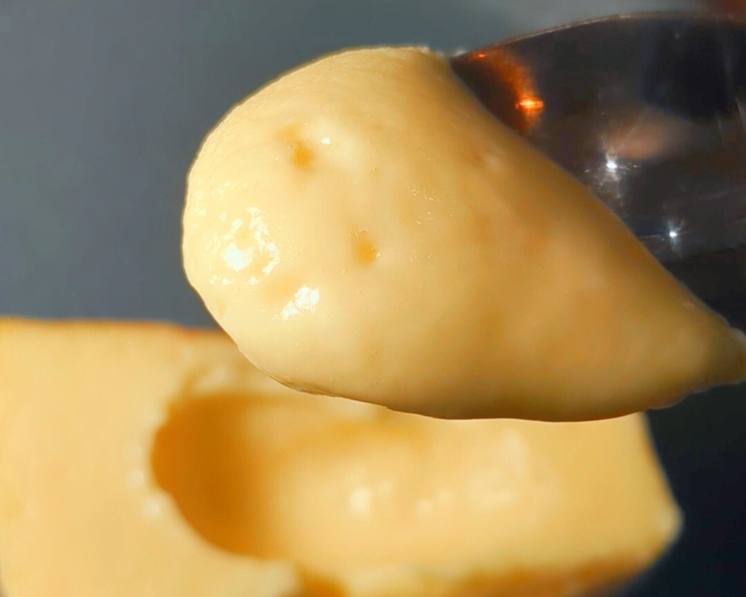 この新しい半熟チーズケーキは、まさに名前の通り中央部分が「半熟」状態になっており、スプーンですくうことが出来るほどトロトロの新食感を体験することができます。
