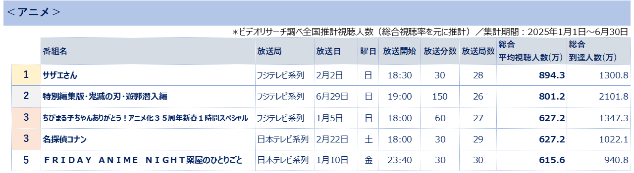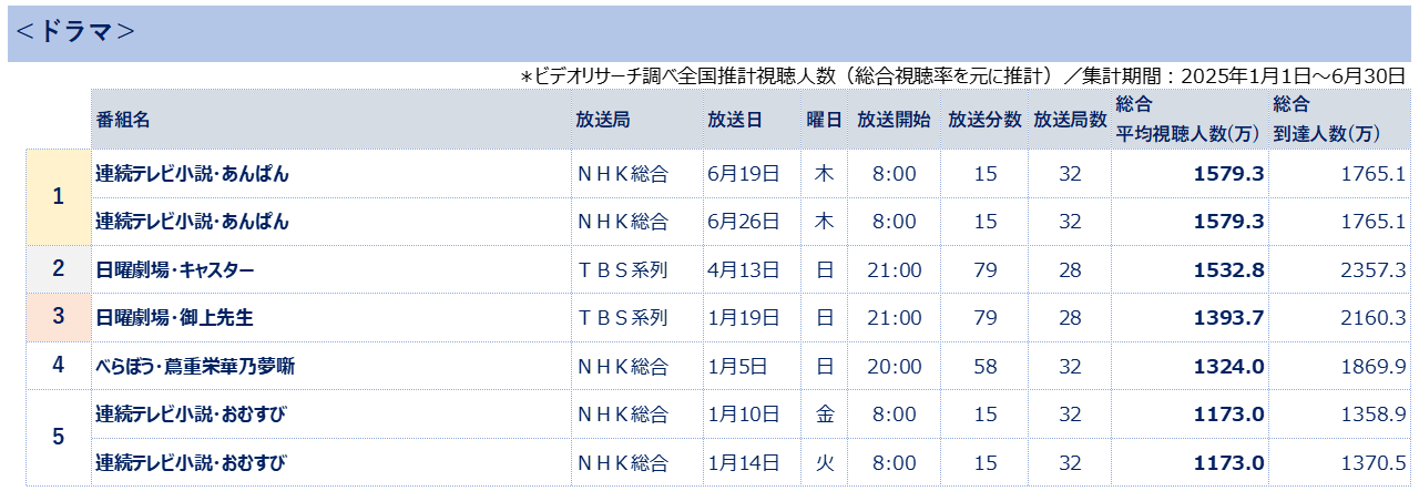 株式会社ビデオリサーチ(本社:東京都千代田区、代表取締役社長執行役員:石川 豊)は、全国32の全放送エリアにて、毎日、個人単位のテレビ視聴状況をリアルタイム視聴および、タイムシフト視聴も対象に調査しています。今回、総合視聴率(リアルタイムもしくは7日内のタイムシフトでの視聴)をもとに算出した2025年上半期の全国推計視聴人数を取りまとめましたのでお知らせします。