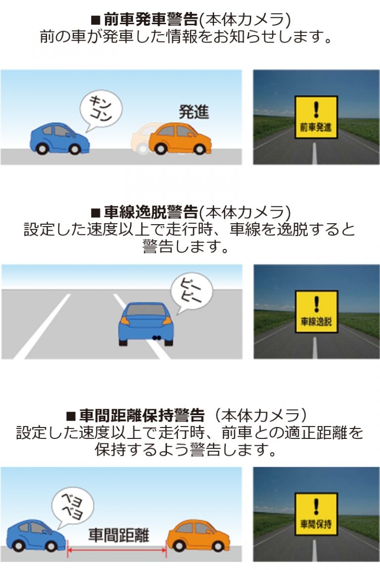 フロントカメラで安全運転支援機能を動作。音と画面表示でお知らせます。