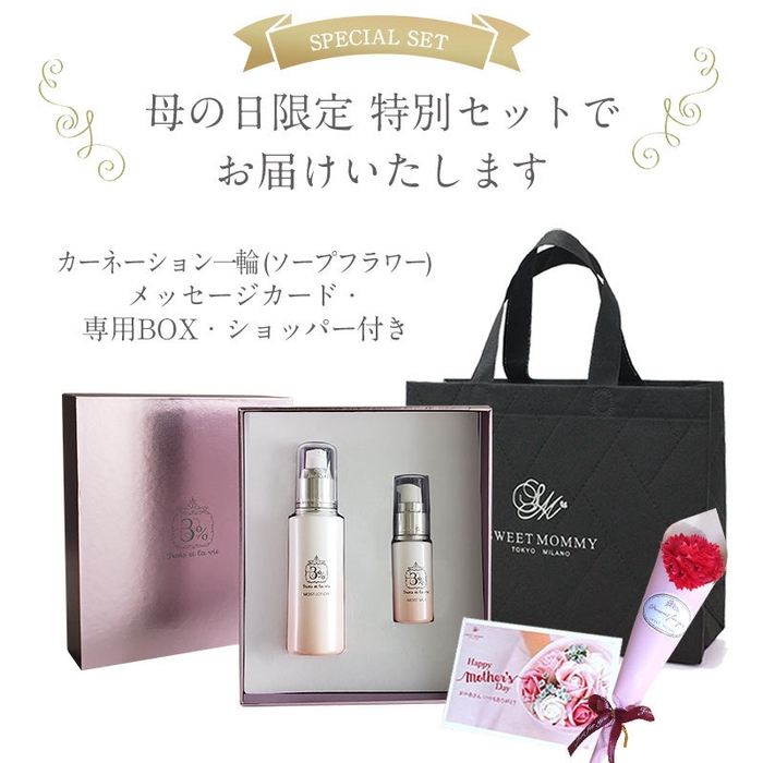 「SWEETMOMMY」(運営会社:株式会社スウィートマミー、所在地:東京都港区、代表取締役:鵜澤 光児)は2023年4月18日(火)より母の日限定ギフト「香りの基礎化粧品セット-カーネーション(ソープフラワー)付き-」の早割を開始いたしました。