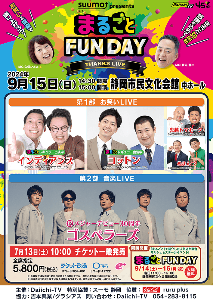 静岡第一テレビの夕方情報バラエティー「まるごと」(平日18時15分~19時00分放送)は、2024年10月に放送開始30周年を迎えます!日頃の感謝の気持ちを込めて、番組の冠イベント「SUUMO presents まるごとFUNDAY ~THANKS LIVE~」を9月15日(日)に静岡市民文化会館で開催します。第1部として、まるごとレギュラーメンバー「インディアンス」や「コットン」など吉本芸人の爆笑お笑いライブ、第2部として、今年12月にメジャーデビュー30周年を迎える男性ボーカルグループ「ゴスペラーズ」が登場します。まるごとと同じ30周年によるコラボ出演。特別なステージをぜひお楽しみください!