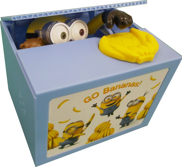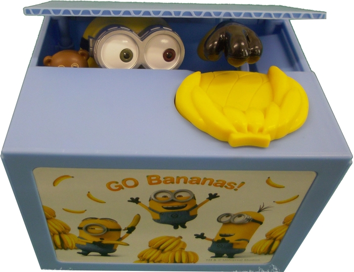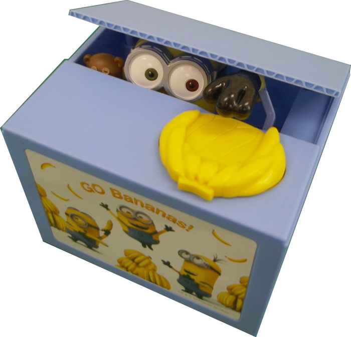 ミニオン達の好きなバナナの形をした皿にコインを置くと、「ティム」を抱いた「ボブ」が箱から現れ、コインを預かって箱に入ります。