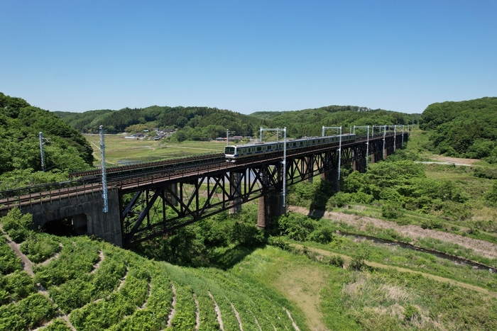 黒川橋梁(上り線)は、近代の鉄道技術を伝える貴重な鋼ワーレントラス橋で、重厚感漂う壮大な石張り橋脚が連続する圧倒的スケールの優美な鉄道橋梁です。
