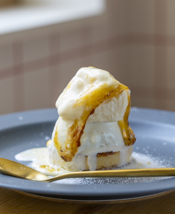 一番下の土台には、ザクっとビスケットを忍ばせたバスクチーズケーキを使用し、その上には濃厚バニラアイスと軽やかなカマンベールチーズムースをのせ、レモンソースと粉糖をトッピング。提供する際は、お客様の目の前でバーナーで炙り仕上げます。レモンソースと粉糖がブリュレされ、下に落ちながらコーティングされたら食べごろ!ブリュレ仕立ての香ばしさが引き立てる濃厚なチーズの味わいと、上はパリッと下はとろ~り冷たい新食感をおたのしみいただけます。