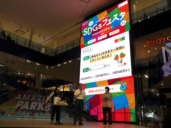 大型LEDビジョンを備えた「AMAMI STADIUM」にて、「環境のお話」をテーマに、クイズを交えて、「食品ロス」や環境に配慮したプライベートブランド「BIO-RAL」など、ライフの環境に関する取り組みを紹介しました。