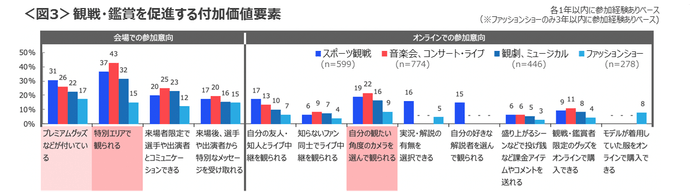 新型コロナの影響を大きく受けるエンタメ業界において、利用促進の一助となりそうな付加価値要素を聴取した。スポーツ観戦・音楽ライブ・観劇では、会場なら「特別なエリアで観られる」こと、オンラインなら「観たい角度のカメラを選んで観られる」ことで参加意向が高く、利用促進の可能性がうかがえる。またスポーツ観戦・ファションショーでは「プレミアムグッズがついている」ことで、会場での参加意向が高い結果となった。<図3>
