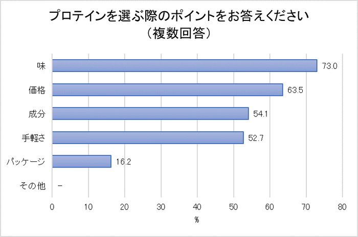 プロテインを選ぶ上で重要視されるのは「味」。続いて、「価格」、「手軽さ」