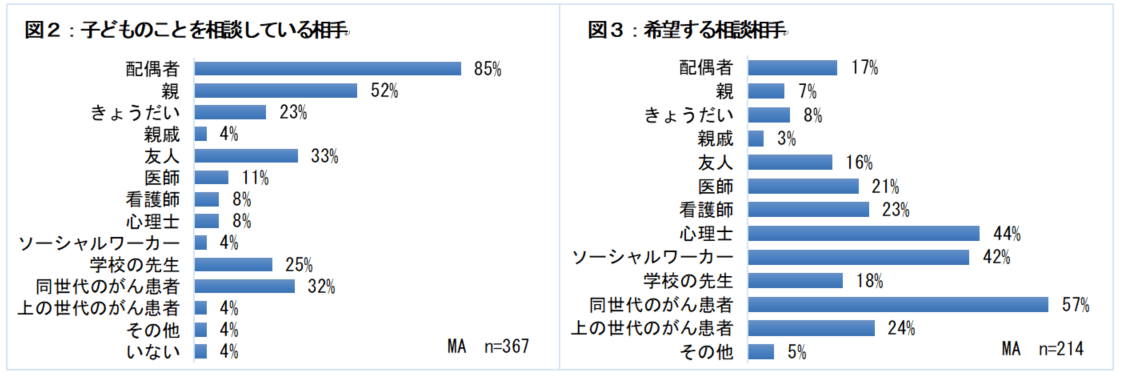 ・今回の調査では、子どもへの説明の支援として「同様の体験を持つ人からの助言」を希望している方の割合が多く、「同世代のがん患者さん」に子どもに関する相談を希望している方の割合も多かったです。結論: