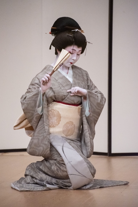 元来小さな空間で屏風を背に燭台の灯りの中、静かに舞われていたことから、少ない動きの中に人の苦悩や哀しみを内に秘め繊細に表現するため、動きの多い歌舞伎舞踊とは一味違った趣があります。