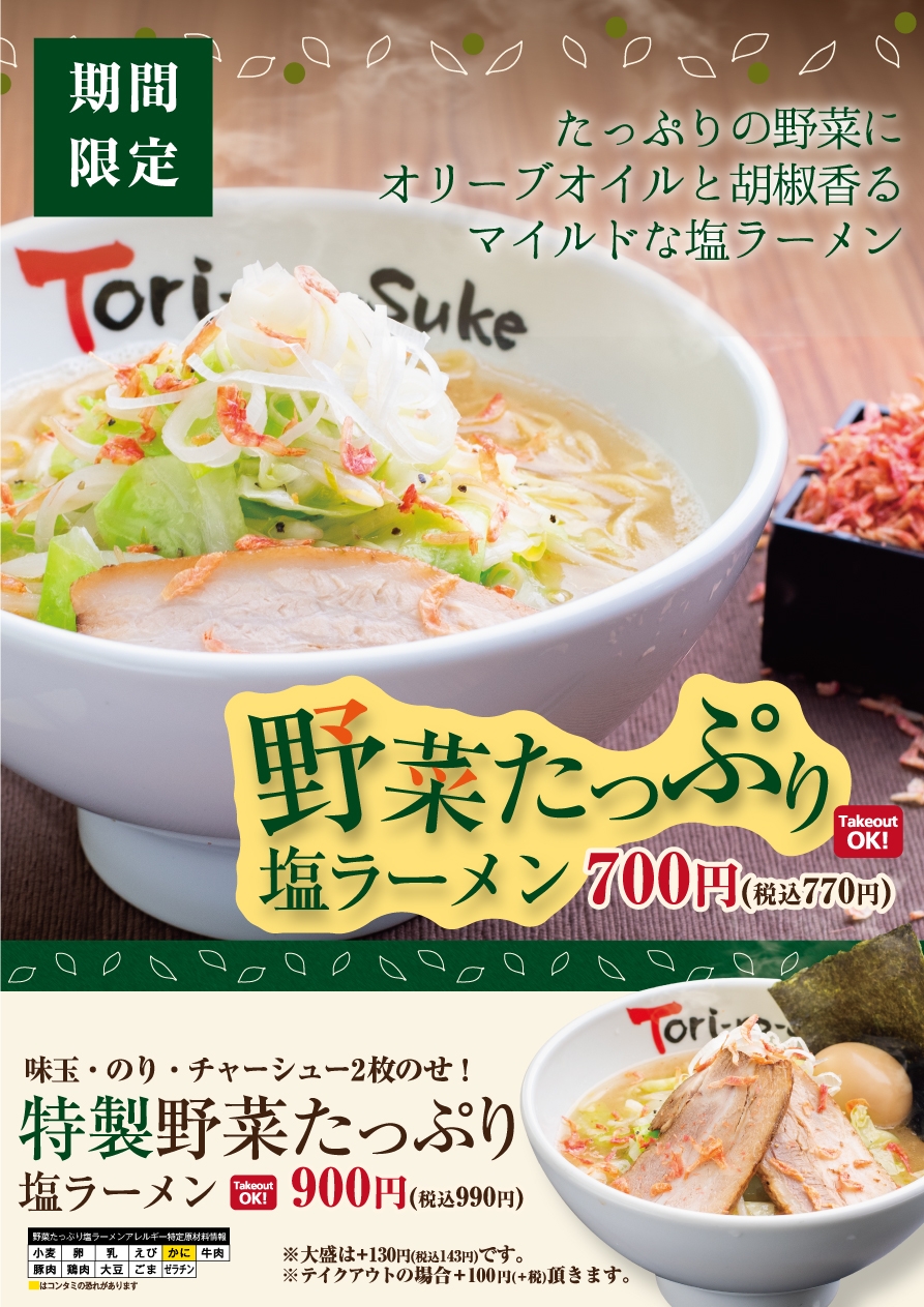 とりの助 秋季限定メニュー「野菜たっぷり塩ラーメン」を9月18日から販売開始