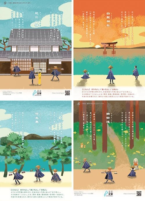 パッケージや店頭POP、添付リーフレットは「近江商人」をテーマとし、近江八幡・白髭神社・竹生島・鯖街道の各所が情緒豊かに描かれ、旅情を誘うデザインになっています。