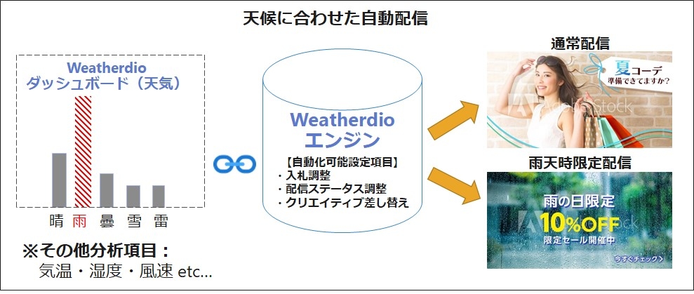 天候の変動が企業の業績に与える影響は大きいと言われており、在庫政策、販促活動、売り場設計に至るオペレーションの迅速な実行を取り組めている企業と、そうでない企業では大きな差を生んでいます。一方で、デジタルマーケティングの世界では、在庫と広告クリエイティブを動的に連動させることが可能で、オフラインマーケティングの世界以上に天候変動をオペレーションに組み込むことによるマーケティング効果の創出が期待できます。今回提供する「Weatherdio」により、過去の売上変動要因の分析結果をもとに、クライアント企業とアイレップの知見を掛け合わせ、クライアント企業のマーケティング課題の解決に最適な広告配信ロジック策定し、リアルタイムで自動的に広告配信をすることが一気通貫で展開可能になりました。