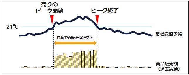 例えば、「カットソー」に関する広告配信を行っている際、購入への寄与度が上がるタイミング、要因を機械学習を用いて特定します。そのタイミングが、最低気温が21℃以上で上昇、17℃以下で下落する場合、「カットソー」の広告配信タイミングを最低気温が21℃以上となる日に開始し、17℃以下となるタイミングで停止するなど、適切な予算配分と配信運用による商品訴求を行います(図参照)。