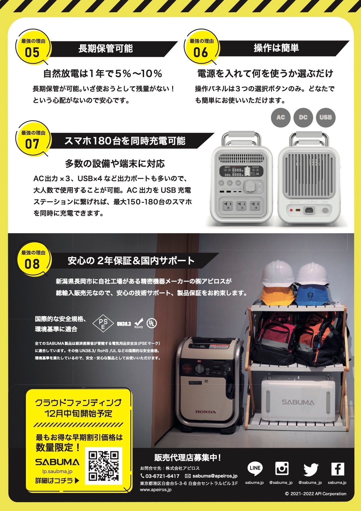自宅でも避難所などの電源がない場所でも充電が可能なSABUMAポータブル電源は、12月下旬よりクラウドファンディング Makuakeにてプロジェクトを開始する予定です。SABUMA特設ページから事前登録すれば、数量限定 30%割引の早割特典情報をお知らせいたします。