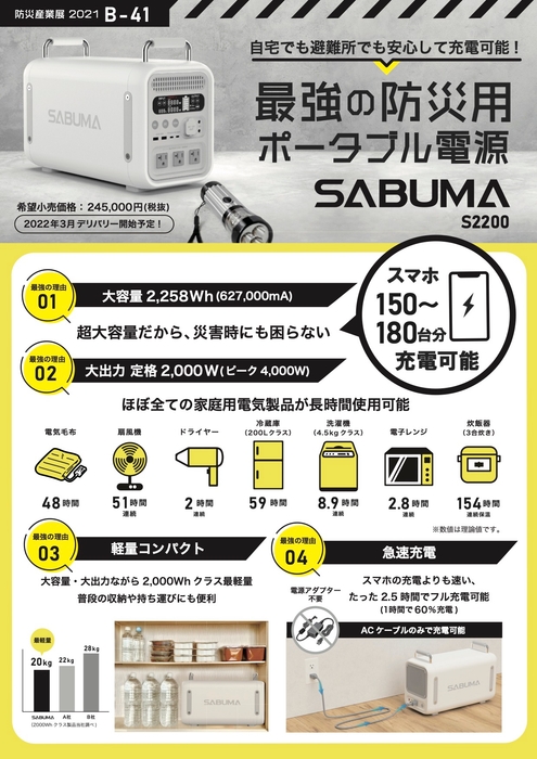 株式会社アピロス(本社:東京都港区)は、自宅でも避難所でも安心して充電が可能なポータブル電源「SABUMA(サブマ)S2200」を12月1日から東京ビッグサイトで開催される防災産業展2021に製品を出展いたします。