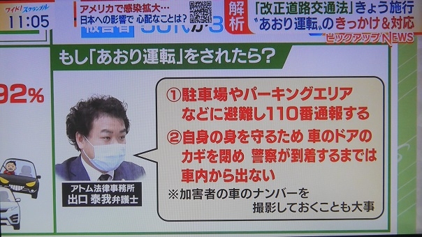 6月30日、テレビ朝日「大下容子ワイド!スクランブル」であおり運転厳罰化について弁護士が解説しました。