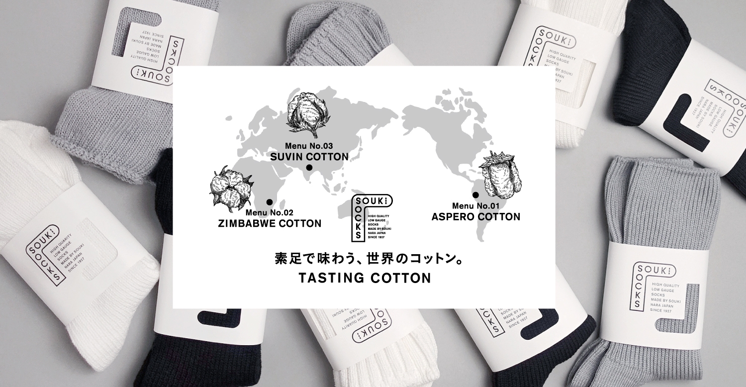 素足で味わう、世界のコットン。希少なコットン3種を履き比べ! 「SOUKI SOCKS -Tasing Cotton-」 ホワイトに続き新色グレー&ブラック登場!