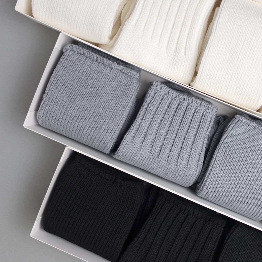 靴下の王道ホワイト、上品でやさしいグレー、端正で凛としたブラック。同じ品種のコットンでも、カラーによって、ふくらみや光沢など印象が違って見えるのが「Tasting Cotton」ならではの魅力です。