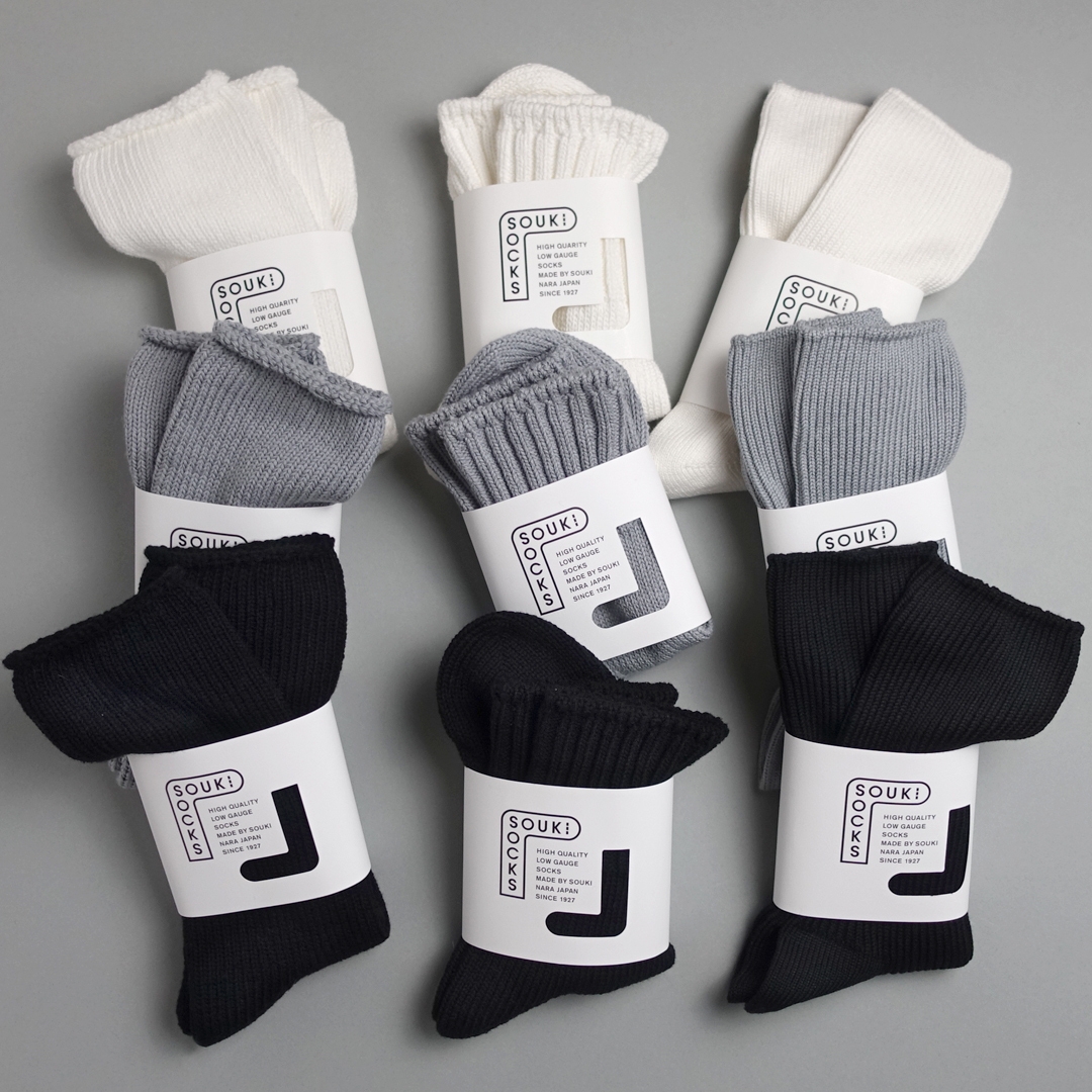 創喜では「扱える職人がごく僅か」ともいわれる珍しい国産のヴィンテージ靴下編機を、大切に修理しながら使いつづけています。中でも編み目が大きくふっくらとしたローゲージの靴下づくりには定評があり、天然素材をたっぷりと贅沢に使う「SOUKI SOCKS」は注目を集めているオリジナルブランドです。