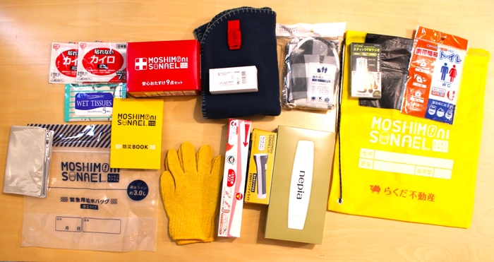 グループ会社である「らくだ不動産」の名前入り!セット内容:持出袋、給水バッグ3L、LEDライト(単三乾電池1本使用:別途)、ホイッスル、アルミシート(1200×800mm)、グローブ、ウェットティッシュ×2、ポリ袋×3、防災ブック、携帯簡易トイレ、ブランケット、使いきりカイロ×2、キッチンラップ、FMポケットラジオ、モバイルバッテリー2000mAh、BOXティッシュ、携帯スリッパ、ポーチ、ばんそうこう(大×4・小×2)、三角巾、テープ、カット綿×6、綿棒×10、包帯