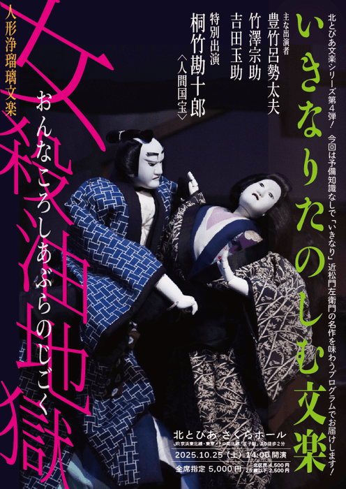 いきなりたのしむ文楽『女殺油地獄 河内屋内の段 豊島屋油店の段』が2025年10月25日 (土)に北とぴあ さくらホール(東京都 北区 王子 1-11-1)にて上演されます。