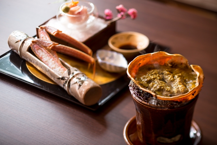 近海で水揚げされたタグ付きの活松葉蟹をお二人様で1杯、銘牛・但馬牛、鮑が付いたスタンダードコース。八寸には珍味といわれる雌蟹もご用意しております。