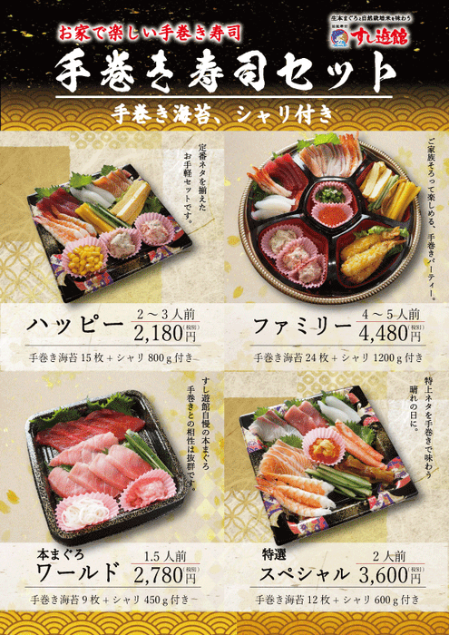 株式会社やまと(本社:岡山県倉敷市、代表取締役:高橋 啓一)のすし遊館は5日2日(土)より、ご自宅でも楽しめるようお持ち帰り用の「手巻き寿司セット」を4種販売いたします。