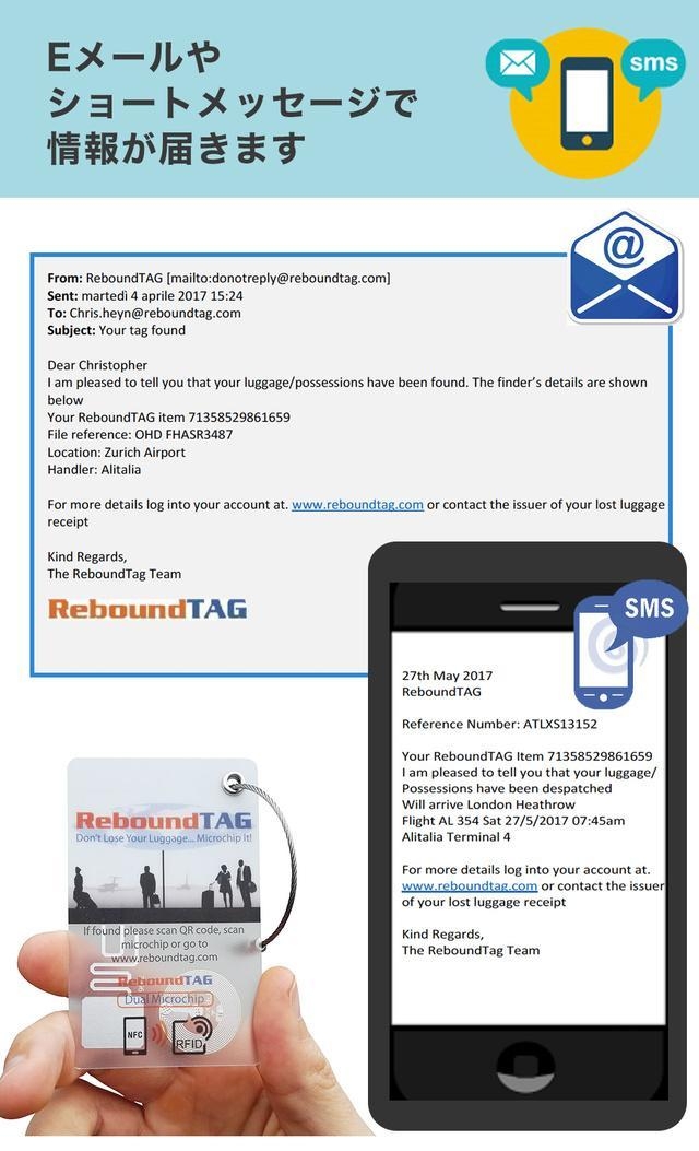 ReboundTAG社は、元々航空会社のマイクロチップシステムの設計を手伝ってきました。この技術を利用したReboundTAGは荷物を紛失した場合、それを見つけたReboundTAGのID登録者からSMS(テキストメッセージ)もしくはEメールで、発見した場所の通知を受け取ることができます。