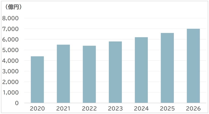 個人経営の飲食店による「出前」や宅配ピザのチェーン店など、飲食店が「宅配」を行うサービスは従来から行われているが、近年、「フードデリバリー」のプラットフォームを運営する企業が、受注と配達の業務を代行するサービスの市場が急激に拡大している。また、2016年に米Uber Eatsが日本でサービスを開始したことが、日本におけるフードデリバリーの本格的な市場拡大の契機となり、さらに2020~21年のコロナ禍の「巣ごもり需要」によって市場が急速に拡大し、2021年は前年比25%増の成長となった。2022年は、こうした特需が終息したことで前年割れの推移となったが、2023年はプラス成長に転じ、市場規模は2021年を上回る約5,800億円に達したと推定される。今後の市場規模の予測としては、共働き世帯、単身世帯や高齢者世帯の増加を背景に、長期的に市場の拡大が続くと見込まれる。