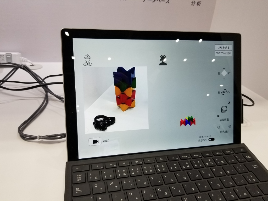 また、支援者からスマートグラスに3Dモデル映像を転送することも可能であり、3Dモデル映像は支援者が拡大縮小回転させることで、その動作をスマートグラス上にも反映可能です。今回は積木を使って、実際の作業支援を体験することができます。 写真(5)(6)
