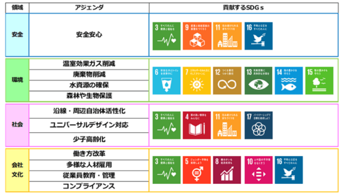 西武グループでは、グループ理念である「グループビジョン」に基づき、持続可能な社会の実現に向けた取り組みを「サステナビリティアクション(ESG活動)」として積極的に推進しています。また、社会課題・当社グループの事業環境等を踏まえて当社グループが特に取り組むべき4領域(安全、環境、社会、会社文化)、12 アジェンダ(重要テーマ)を設定し、アジェンダに沿った取り組みを進めております。