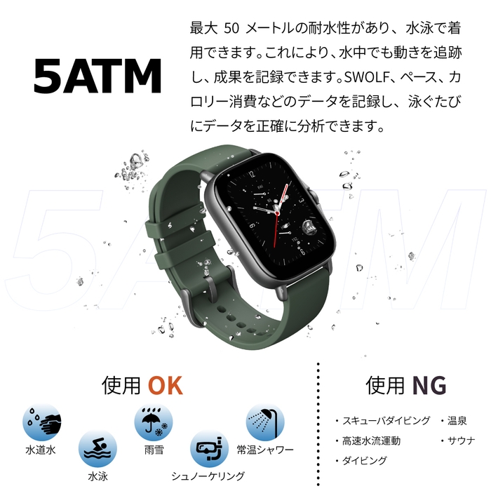 50メートルの深さまで保護を提供するプロの防水のおかげで 、私たちの新しいスマートウォッチは、従来のハイエンドの時計と同等であり、毎日の使用や水泳のために心配のない着用することができます。