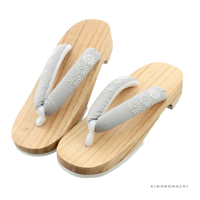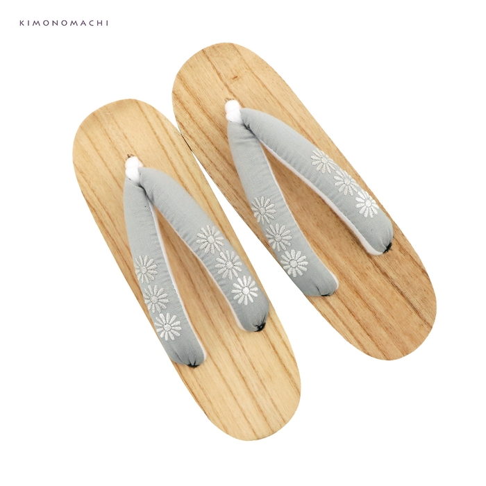 素朴な質感の明るいグレーの鼻緒に、レトロなお花の刺繍。白鼠色、ごく淡いグレージュ、淡いグレージュの3色の刺繍の花がさりげないオシャレです。