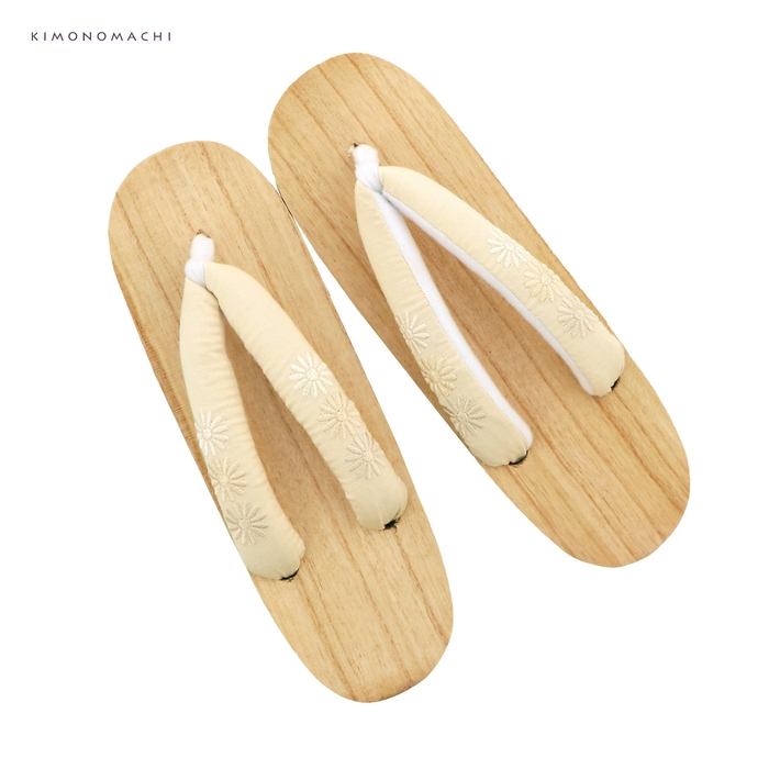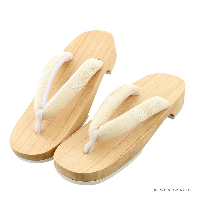 素朴な質感の浅いアイボリーの鼻緒に、レトロなお花の刺繍。浅いベージュ、やや黄みのベージュ、淡い生成色の3色の刺繍の花がさりげないオシャレです。