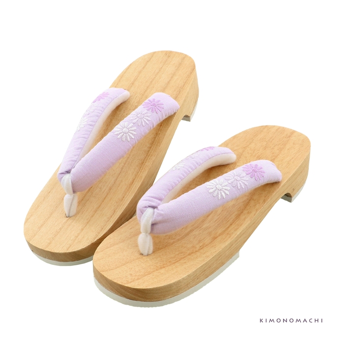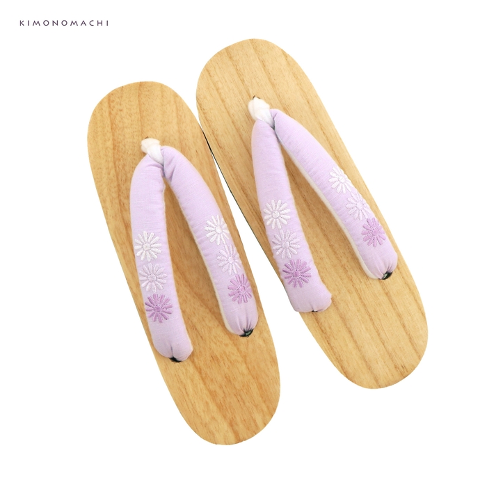 素朴な質感の浅い薄紫色の鼻緒に、レトロなお花の刺繍。パープル、ごく淡い白藤色、白の3色の刺繍の花がさりげないオシャレです。