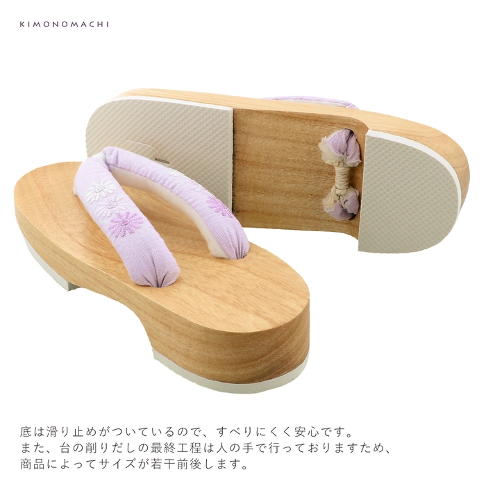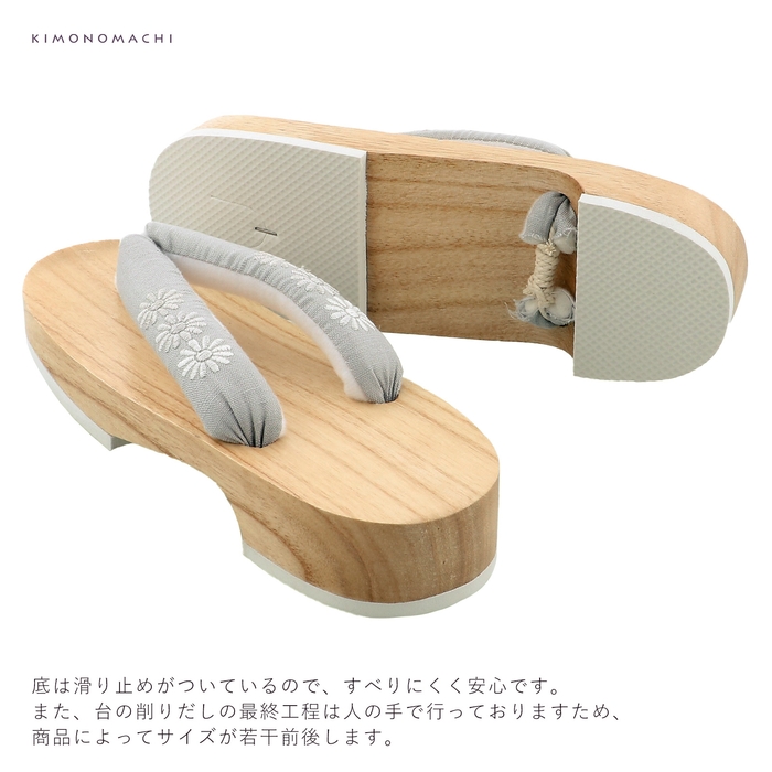 京都きもの町オリジナルの女性下駄です。台は桐の白木で、鼻緒に刺繍が入っています。鼻緒は裏地がふわふわですので、擦れて痛くなりにくい下駄です。また、ゴム底なので、滑りにくく安心です。浴衣に合わせて、オシャレな下駄を合わせてみてはいかがでしょうか。