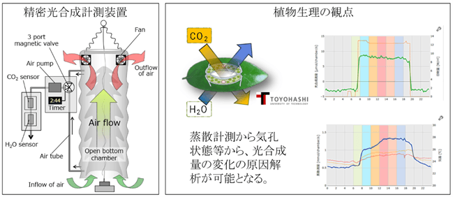 ファームシップは、次世代農業の未来を切り拓くため、省エネ技術の実用化を目指し、これまでの研究成果に豊橋技科大・高山弘太郎教授の研究室の知見を融合し、研究開発をさらに強化します。高山教授は、植物の光合成および蒸散の精密計測によるリアルタイム解析技術(図1)を活用し、栽培条件を最適化することで、さらなる省エネルギー化を実現します。高山教授は、植物生理や解析技術において卓越した知識を持ち、特にリアルタイム解析の分野で高い評価を得ており、今回の共同研究においても重要な役割を果たします。これにより、省エネルギー化を一層進化させ、技術の実用化を加速させることを目指しています。