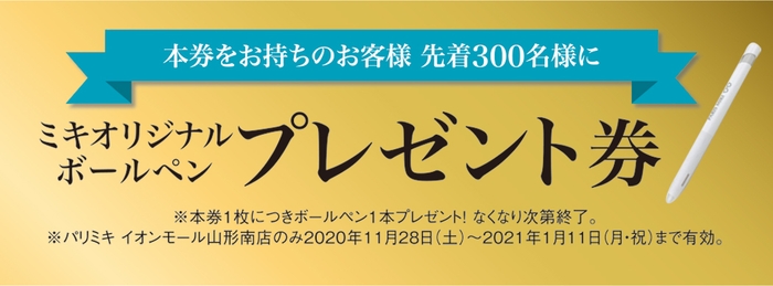 オープン記念として、上記のプレゼント券を印刷してお持ちの方 先着300名様に、ミキオリジナルボールペンをプレゼントいたします!どうぞこの機会にゲットしてください!