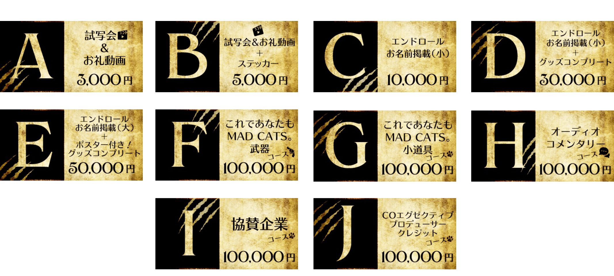 映画「MAD CATS」を愛したくなるような、様々なリターンを用意しています。