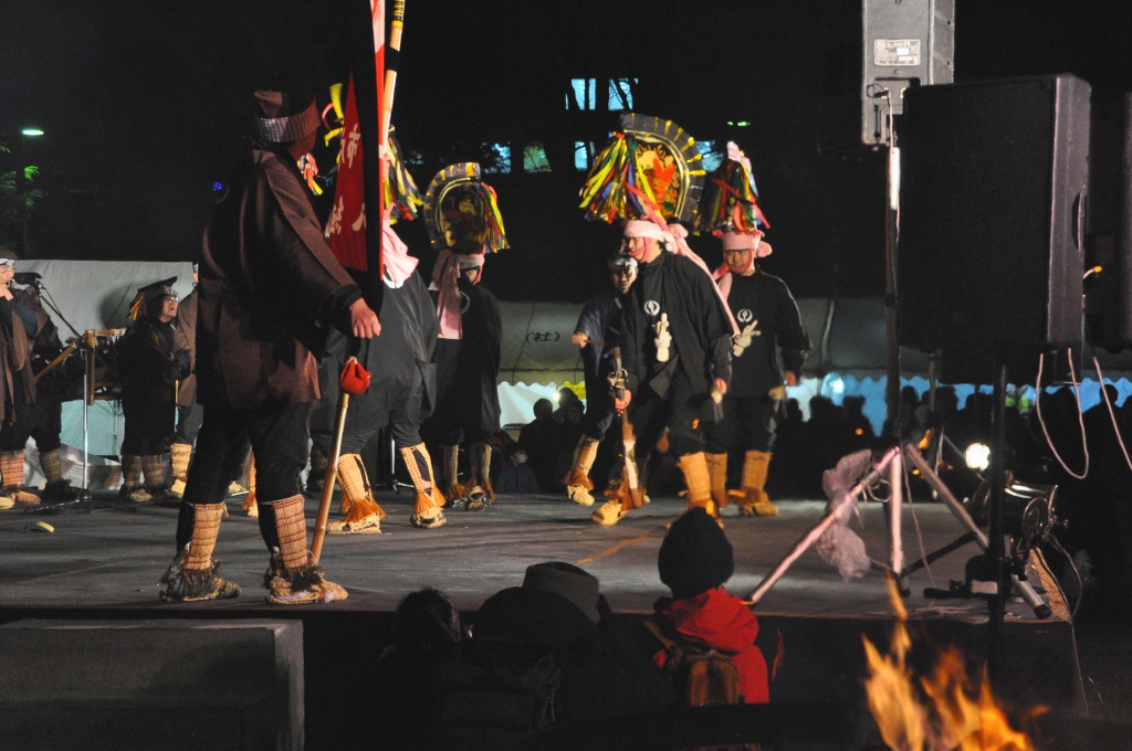 八戸市庁前広場にかがり火が焚かれ、その明かりの中でえんぶりが行われます。かがり火に照らされ、烏帽子がきらめく太夫の舞や、夜空に響きわたるお囃子は情緒があり、昼とは異なる魅力に溢れています。2月18日の、5つのえんぶり組が一斉に摺る「五組摺り」も見ものです。