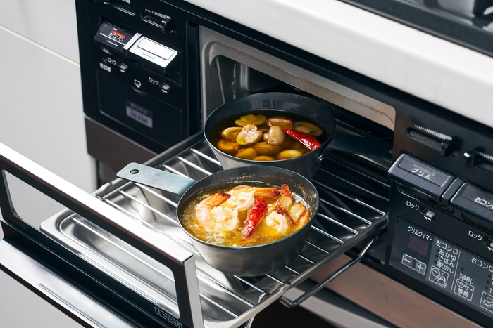 鉄の熱伝導を活かして鉄フライパンと鉄カップを重ねて同時に調理が可能。