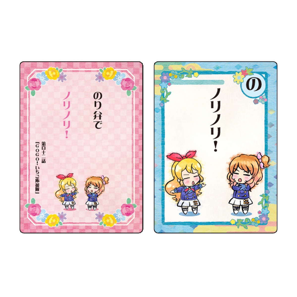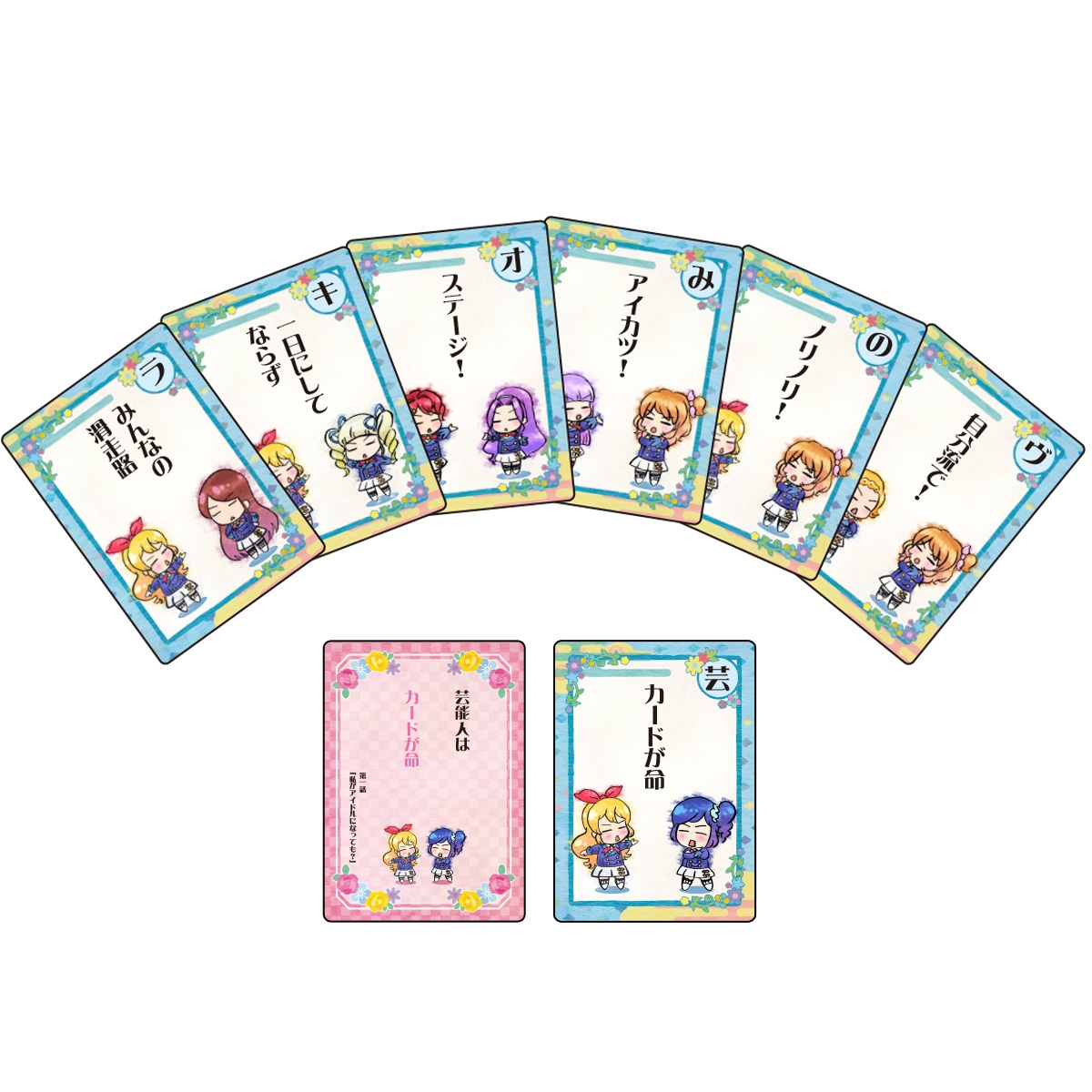 TVアニメ『アイカツ!』内に設けられたミニコーナー「アイカツ格言」に登場した「芸能人はカードが命」や「ライブは一体感!」などの格言を「かるた」にして読み札153枚、取り札153枚を収録しました。さらに、本商品のために撮りおろした競技用読み上げCD2枚・特製風呂敷1枚つきです。