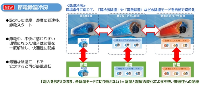 温度に加え最適な除湿モードで湿度を制御しながら節電する「節電除湿冷房」運転