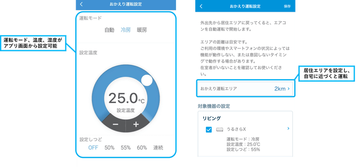 ・帰宅前に、予めアプリでお好みの温度と湿度に設定しておくことで、自宅に近づくと自動でエアコンが運転。お好みの温湿度で快適になったお部屋に帰ることができます(※自動運転での「おかえり運転」設定は、湿度のみが設定可能となります)。
