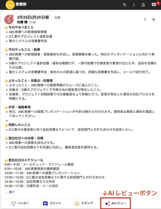 それぞれの日報に設置されている「AIレビュー」ボタンを選択します。
