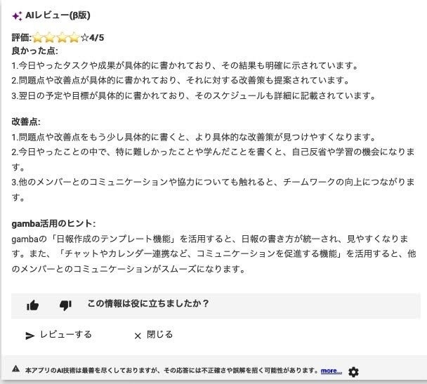 gamba!に新たに搭載されるAIによる日報レビュー機能(β版)(以下、「AIレビュー機能」)は、ユーザーが投稿した日報の内容をChatGPT連携して詳細に分析し、かつ具体的なフィードバックを提供します。