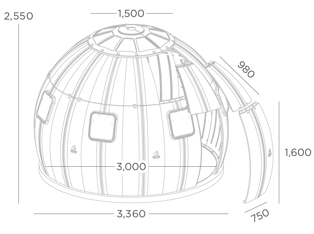 イージードームハウスは、直径3.3m高さ2.6mで、簡単な工具があれば60分ほどで組み立てることができるドームハウスです。外部衝撃に強く、高い耐水性を持つHDPE(高密度ポリエチレン)製の壁面パネルは独自の紫外線遮断処理加工により耐久性を兼ね備えています。