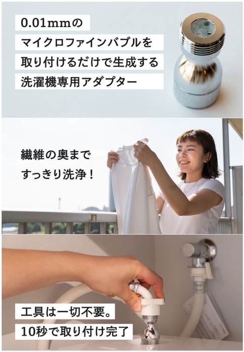 クラウドファンディングで3,400万円の支援を集めたプロジェクトの第2段!!簡単装着で100億個のマイクロファインバブルで洗濯革命「SAWAWA 洗濯用」