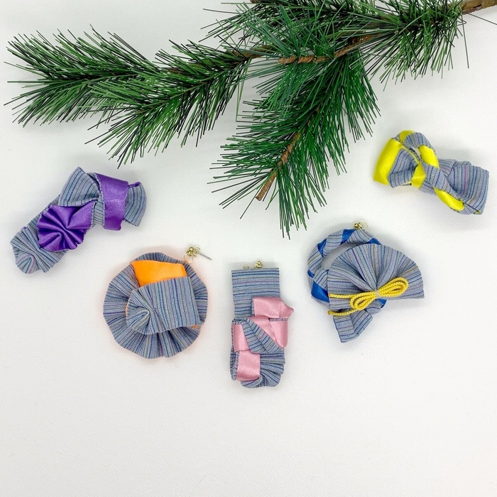 仕立ての際に出るはぎれや金襴裂地などからミニサイズの帯を作り、そこから作品とほぼ同じようにハンドメイドでひとつずつ成形したアート性の高いアクセサリーです。